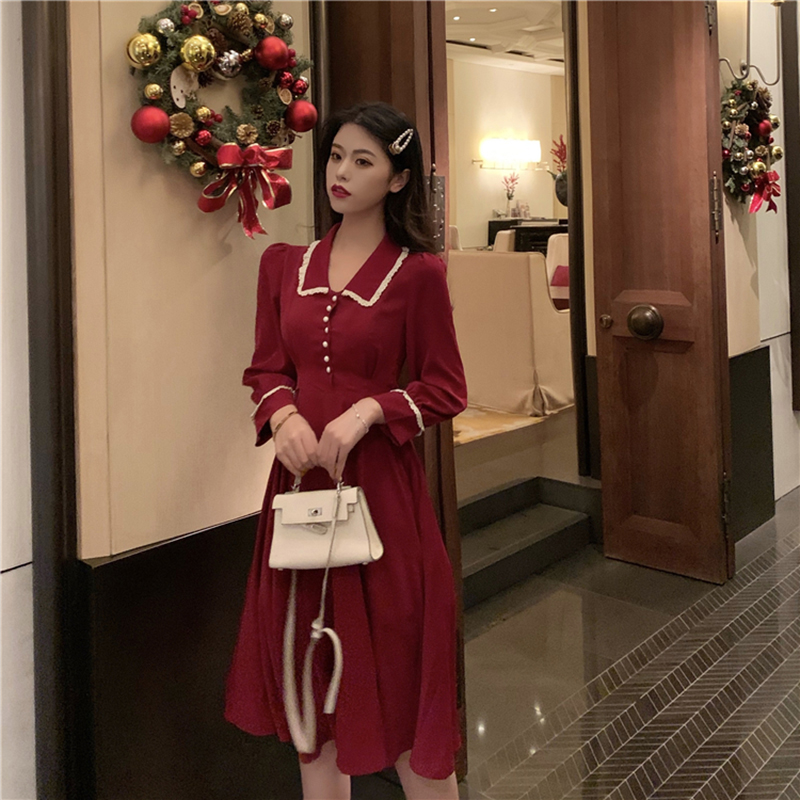 Váy đầm nữ dáng dài xòe cổ bẻ, mẫu váy đầm nữ đẹp dài tay, 2 màu đen đỏ nổi bật, chân váy dài qua gối nữ tính-M041