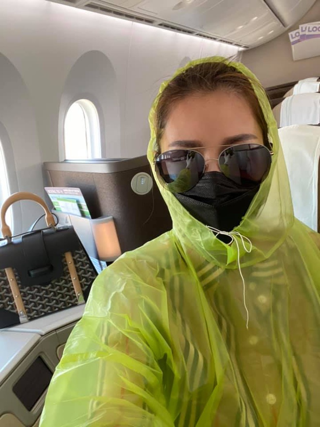 Quế Vân chất hết nấc với trang phục bảo hộ và ngồi khoang hạng nhất trên máy bay